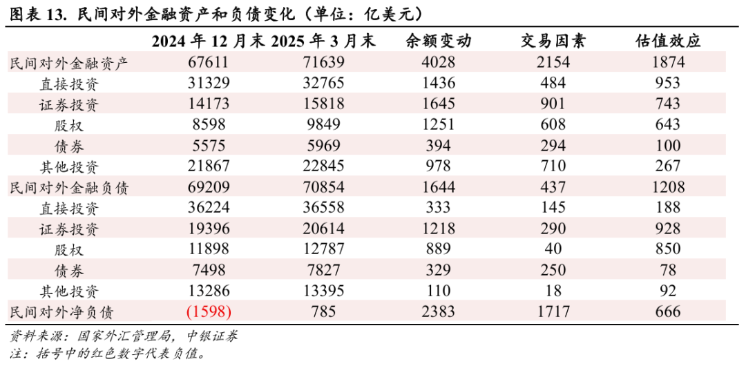 截至2025年3月末,民间部门对外资产余额为71639亿美元,较上年末增加4028亿美元,其中交易因素影响(即内资流出)和估值效应分别为2154亿、1874亿美元,贡献了对外资产余额增幅的53%、47%。同期,民间部门对外负债余额增加1644亿美元,其中交易因素影响(即外资流入)仅为437亿美元,远小于国内股市上涨和人民币汇率升值等带来的估值效应1208亿美元(当季人民币汇率中间价累计升值0.1%,带来的估值效应约为71亿美元【4】),二者分别贡献了对外负债余额增幅的27%、73%(见图表13)。