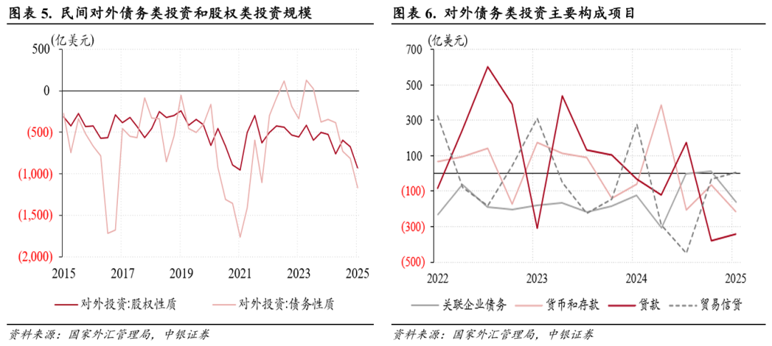 在对外债务类投资中,贷款净流出规模同比增加309亿至342亿美元,为2022年以来次高;货币和存款净流出规模增加155亿至214亿美元,为2022年以来新高;关联企业债务净流出规模增加38亿至161亿美元,而上季度为净流入13亿美元。这反映出本外币利差倒挂程度加深背景下,银行和企业等部门正常的财务操作影响,当然也不排除在美元指数下行、人民币汇率压力缓解背景下,境内资金出境要求放松的可能。当季,出口应收等贸易信贷资产由此前连续三个季度净流出转为净流入,但净流入规模由上年同期280亿收窄至3亿美元(见图表6)。