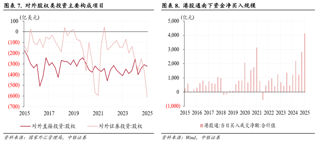 对外债务类和股权类投资净流出规模同比齐增,分别反映中美利差倒挂程度加深和南下资金加速进入港股市场影响
