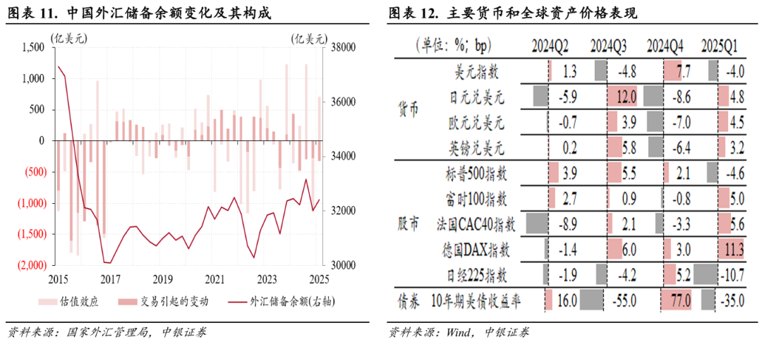 当季,美国贸易政策不确定性增加,引发从特朗普交易到特朗普衰退的市场预期反转,标普500指数累计下跌4.6%,美元指数累计下跌4.0%,10年期美债收益率回落35个基点。伴随着美国股汇“双杀”,主要非美货币汇率出现明显反弹,日元、欧元和英镑对美元汇率分别升值4.8%、4.5%和3.2%,欧洲股市涨幅可观,德国DAX指数累计上涨11.3%,法国CAC40指数、富时100指数分别上涨5.6%和5.0%(见图表12)。这意味着持有非美元资产,将受益于汇率和资产价格变化产生账面收益。