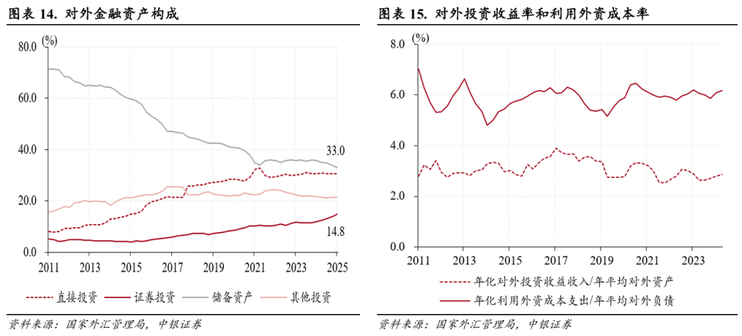 伴随着民间对外投资增加和正估值效应影响,截至2025年3月末,我国对外金融资产中储备资产占比较上年末回落了0.8个百分点至33.0%,刷新历史新低(见图表14)。然而,由于对外金融资产和负债结构差异仍然显著,一季度我国对外投资收益率为2.9%,远低于利用外资成本率6.2%,二者缺口连续七个季度超过3个百分点(见图表15)。当季,投资收益逆差194亿美元,由于对外资产环比扩张快于对外负债,逆差环比缩小了281亿美元。