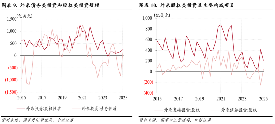 外资由此前连续两个季度净流出转为净流入,但净流入规模同比收窄,其中外来债务类和股权类投资净流入规模此消彼长,后者主要反映了“中国资产重估论”影响。
